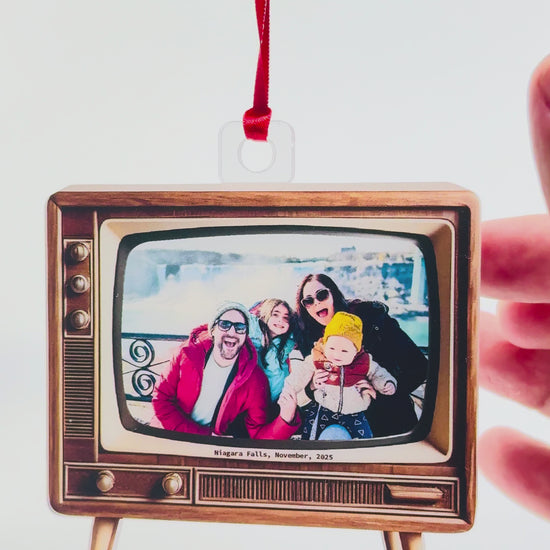 Bring a touch of nostalgia to your holiday décor with this old TV-shaped ornament, customized with your favorite photo and message. Made from premium acrylic and featuring double-sided UV printing, this retro-inspired keepsake displays your image clearly on both sides—just like your favorite show from the past!